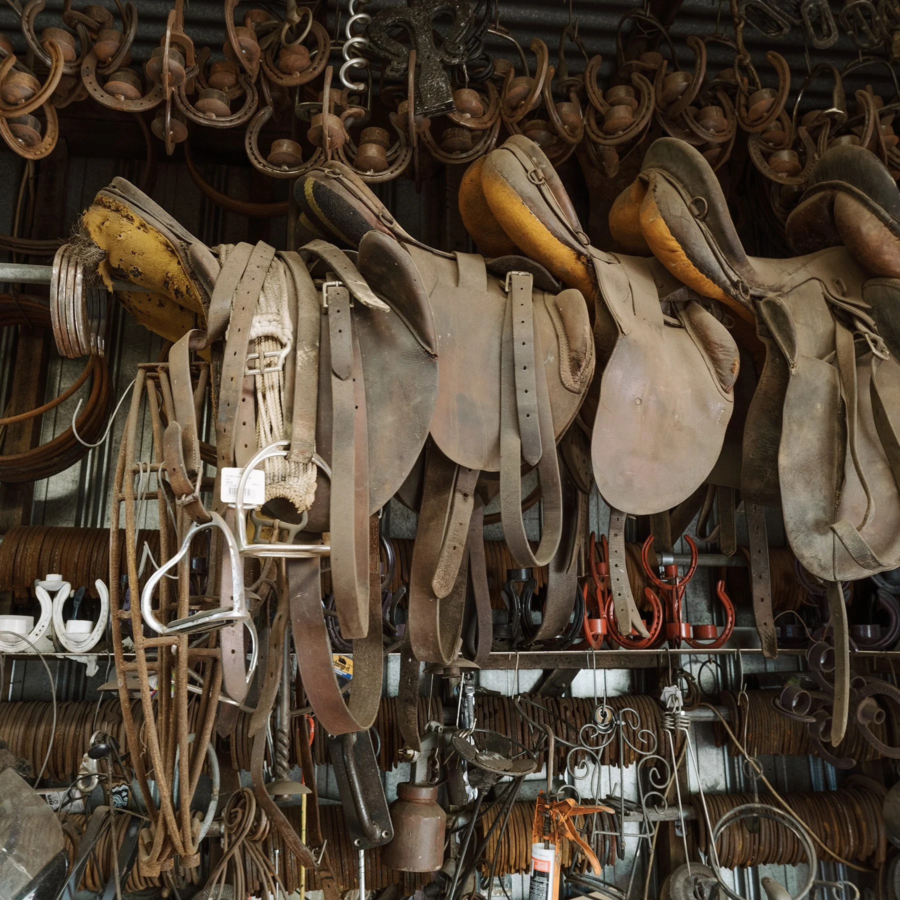 I’m wondering if I’m stuck in this groove forever now. That is the square format. I had forgotten about it and that my camera was set to that mode from the last session. Looking at the photos taken today, I’m not disappointed. It’s an experiment gone right. I couldn’t identify the objects hanging from the ceiling here but they complement the old saddles nicely. I’m also enjoying the red and yellow highlights in the background. This display of goods belongs to the iron horse man. Some more photos to come with background story.