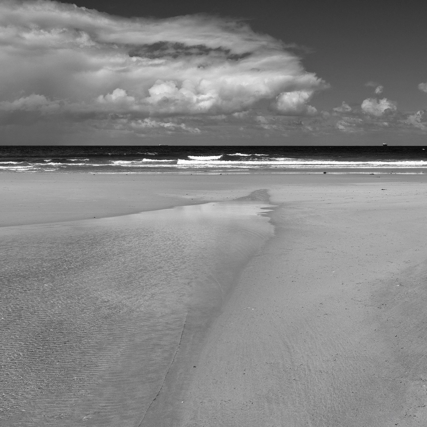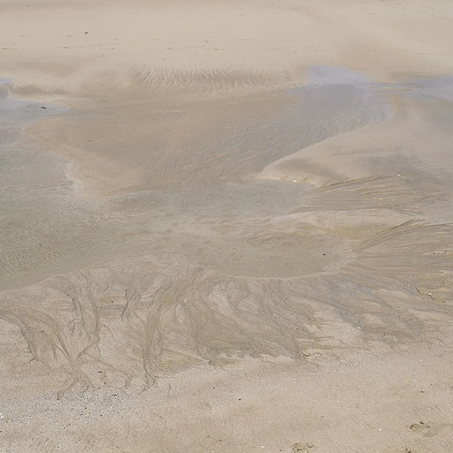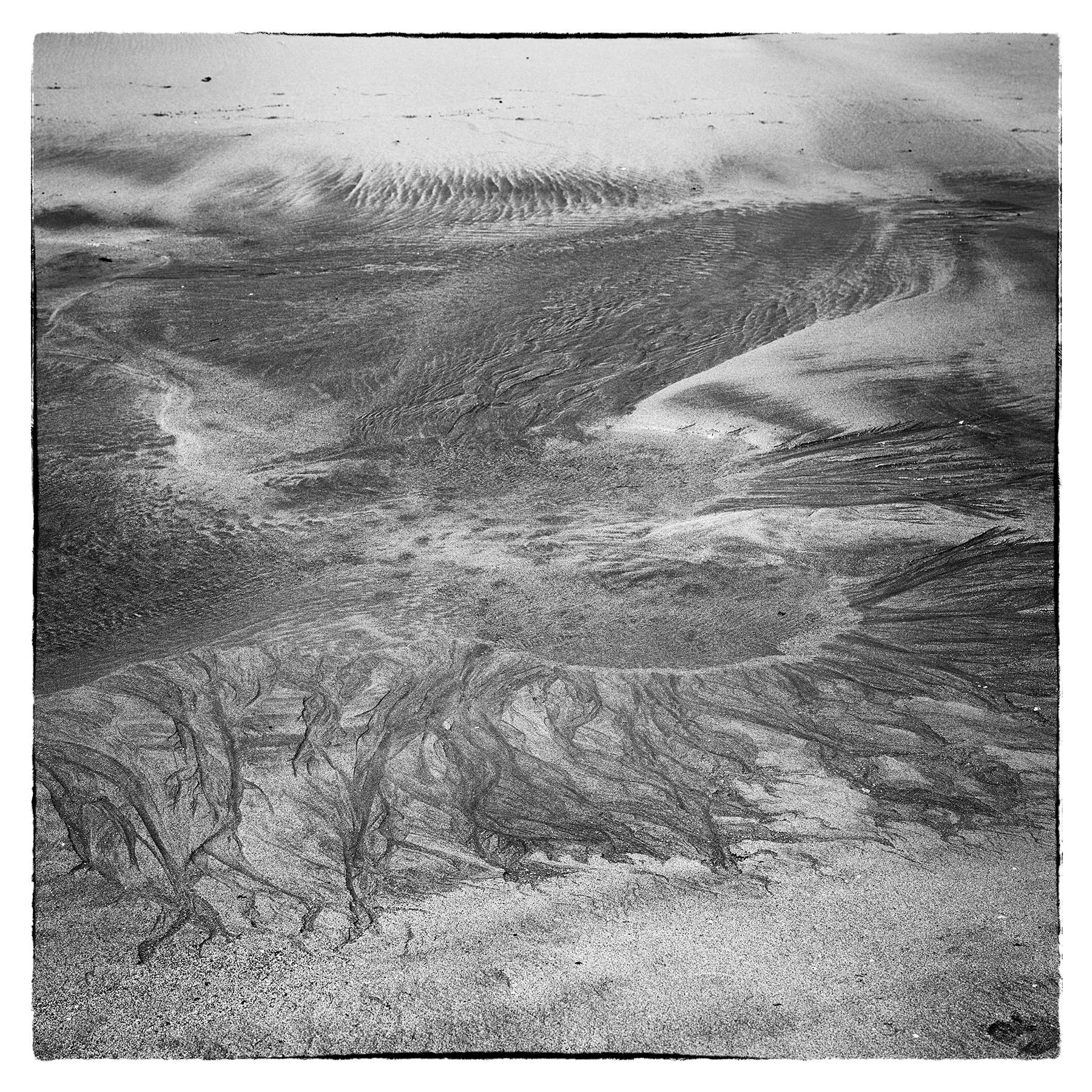 The original image shows very little contrast. I mean minimal. You may not even consider taking this shot due to it’s invisibility. When converting to b&w image I like to experiment a little. Increasing the contrast significantly (adding black) brings out the details. This image had an extraordinary amount of texture hidden in the original exposure.. I have to see that to some extent and for which reason I went ahead and took this photo. Bizarre looking tentacles are simply water tracks in the sand. And because the image has become unrecognisable for what it is, scale is also difficult to work out making us think a lot more about what we are seeing.