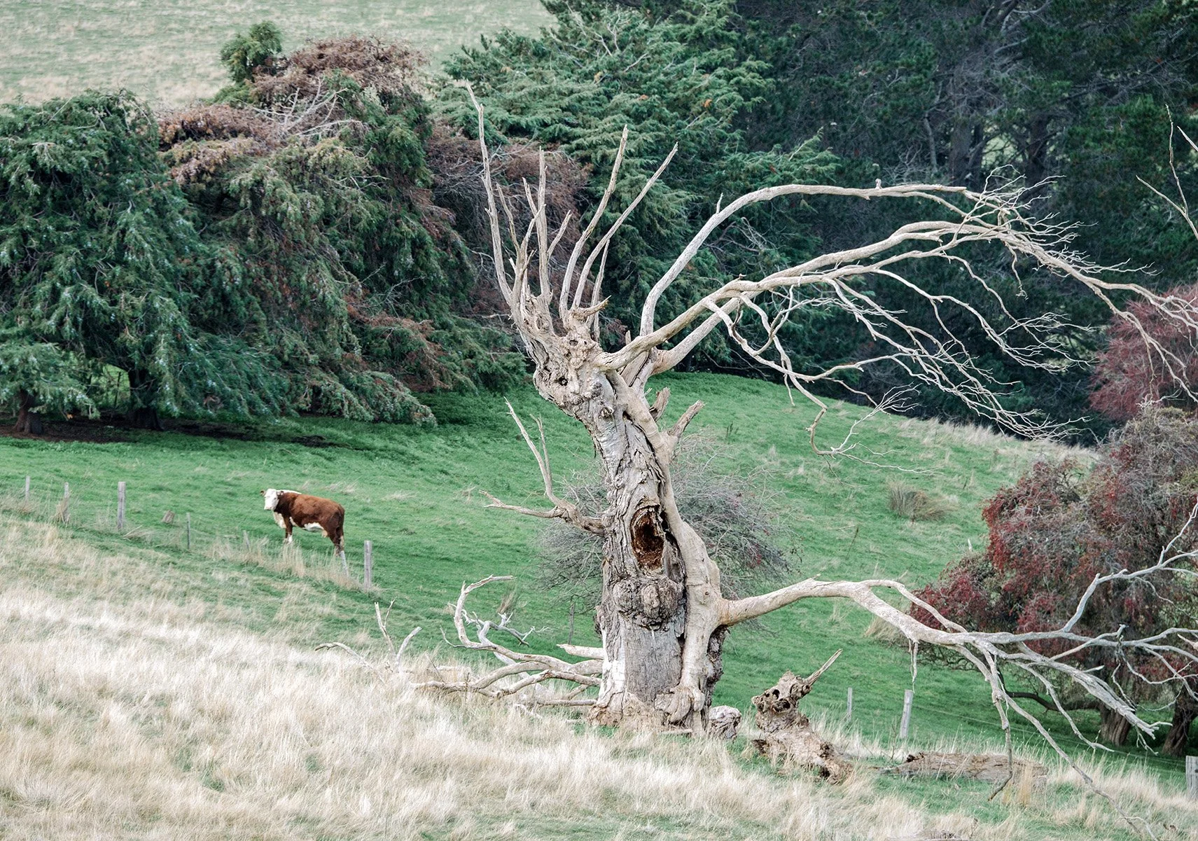 Colour version of a photo taken back in 2015, travelling around New Norfolk in Tasmania.The tree itself stood out (haha) on it’s own but the cow in the background provides an extra layer of imagery.